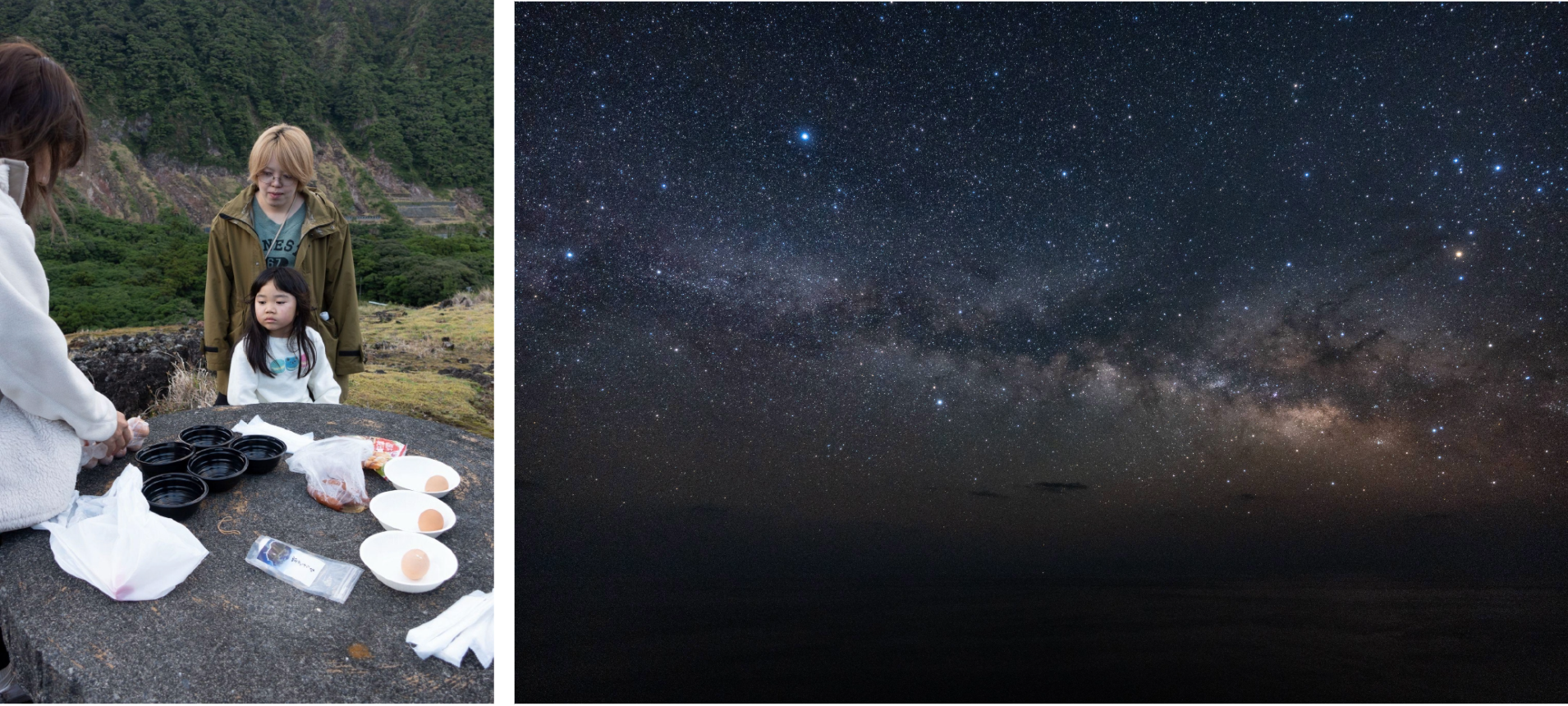 左:ひんぎゃ(地熱釜)体験 / 右:国内有数と言われる星空の鑑賞会も